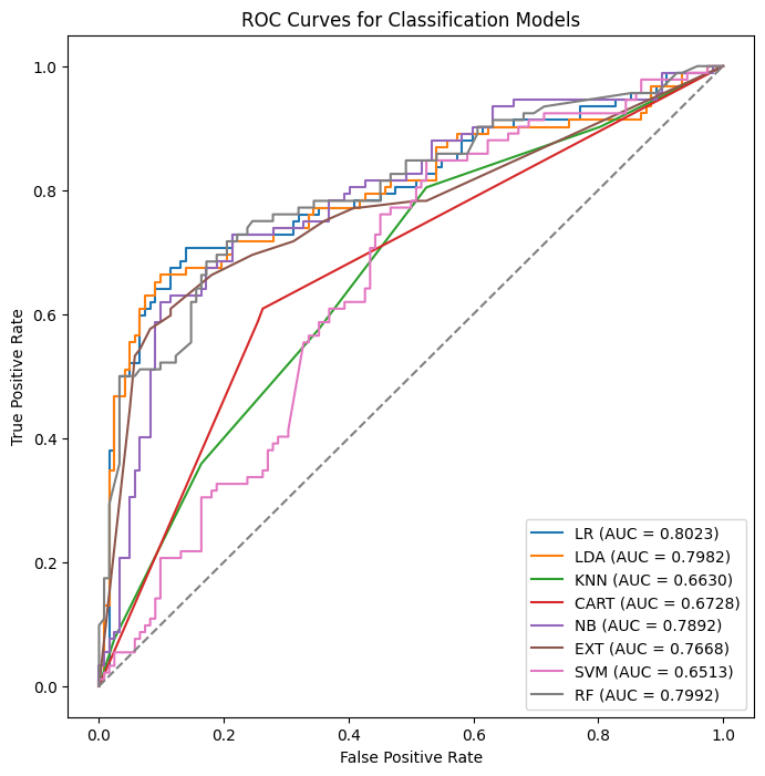 plt.title("ROC Curves for Classification Models")