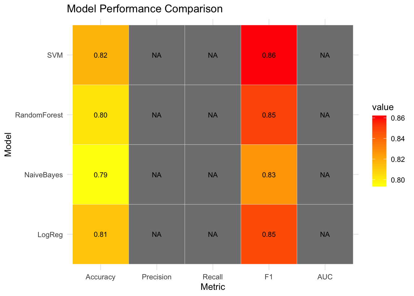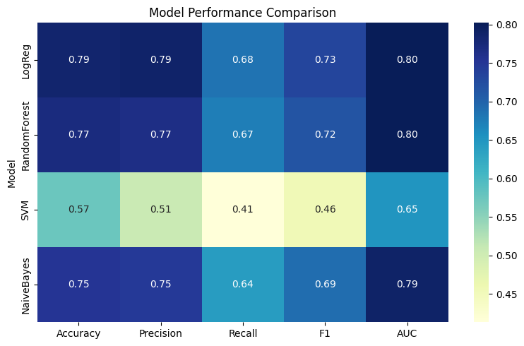 ✅ Takeaway: Comparing multiple models in one place lets you make evidence-based decisions — not just based on accuracy, but also on precision, recall, F1, and AUC. A heatmap helps visually spot strengths and weaknesses across classifiers.