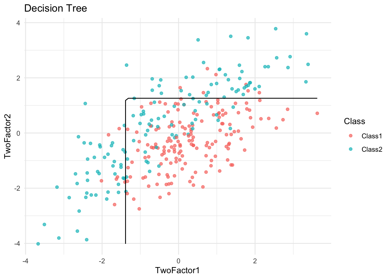tree_model <- train(Class ~ TwoFactor1 + TwoFactor2, data = df, method = "rpart")