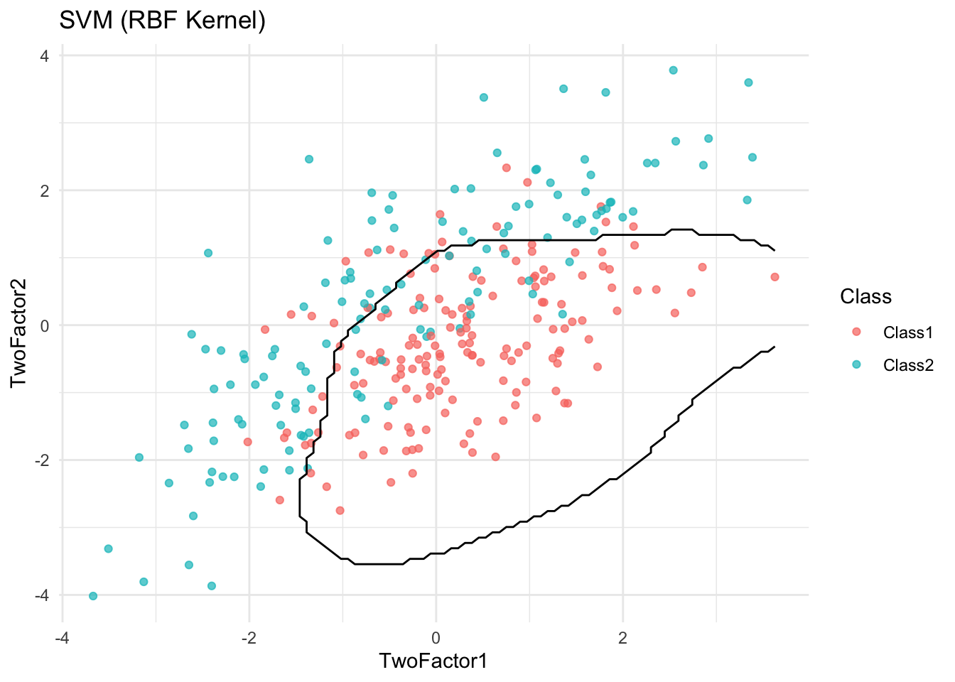 svm_model <- train(Class ~ TwoFactor1 + TwoFactor2, data = df, method = "svmRadial")